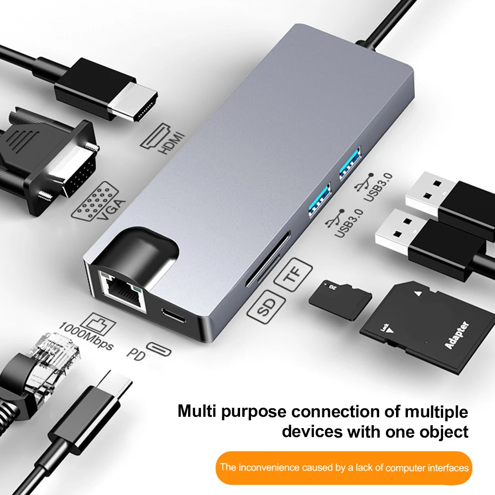 (6) 8 em 1 1000M: HD 4K@30HZ*1+VGA*1+1000M RJ45*1+PD 87W*1+SD*1+TF*1+USB 3.0*2